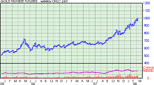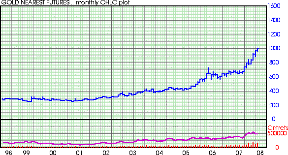 At last look, gold for April delivery spiked to an all-time nominal high of $1000.80 an ounce. The precious yellow metal has gained about 18% so far this year, after tacking on nearly 32% during 2007.